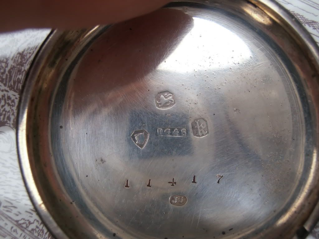 I have a pocketwatch that I finally figured out how to open. I expected to find a makers mark on the movement, but was disappointed to find nothing. The only marks are on the silver case. The serial number on the movement and case match so it is original. I'm hoping someone can help with the marks on the case to help me figure out who the watchmaker is?