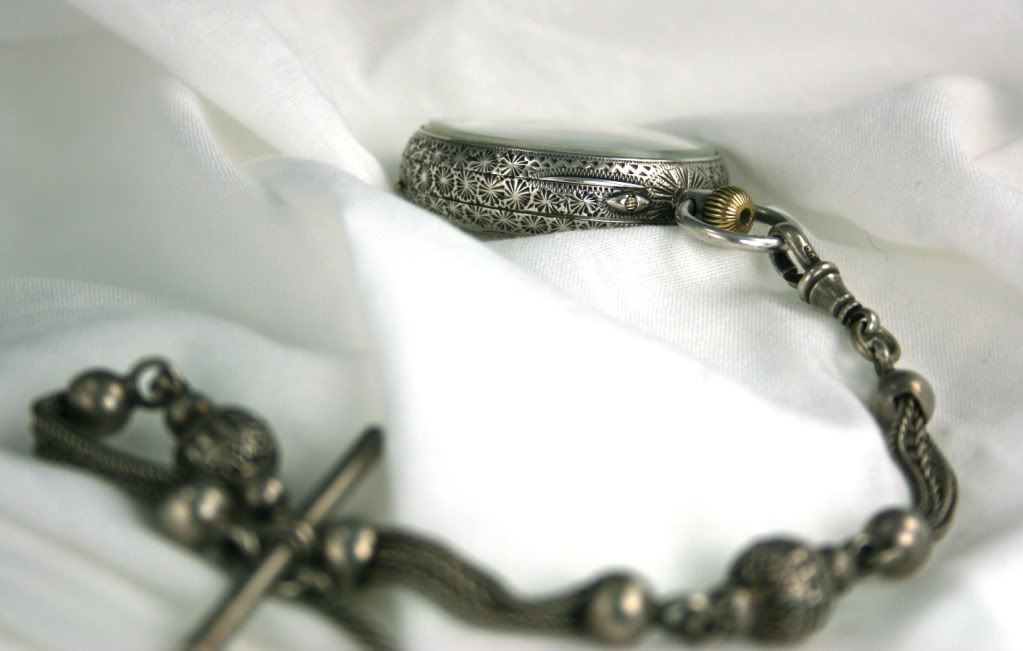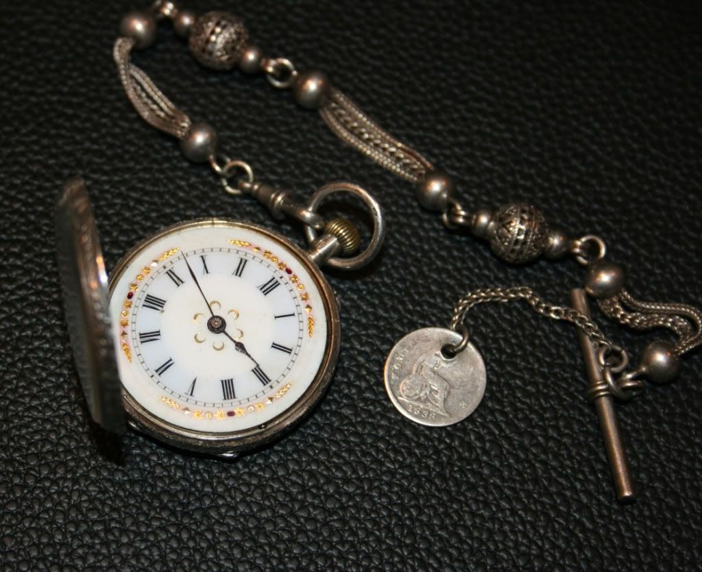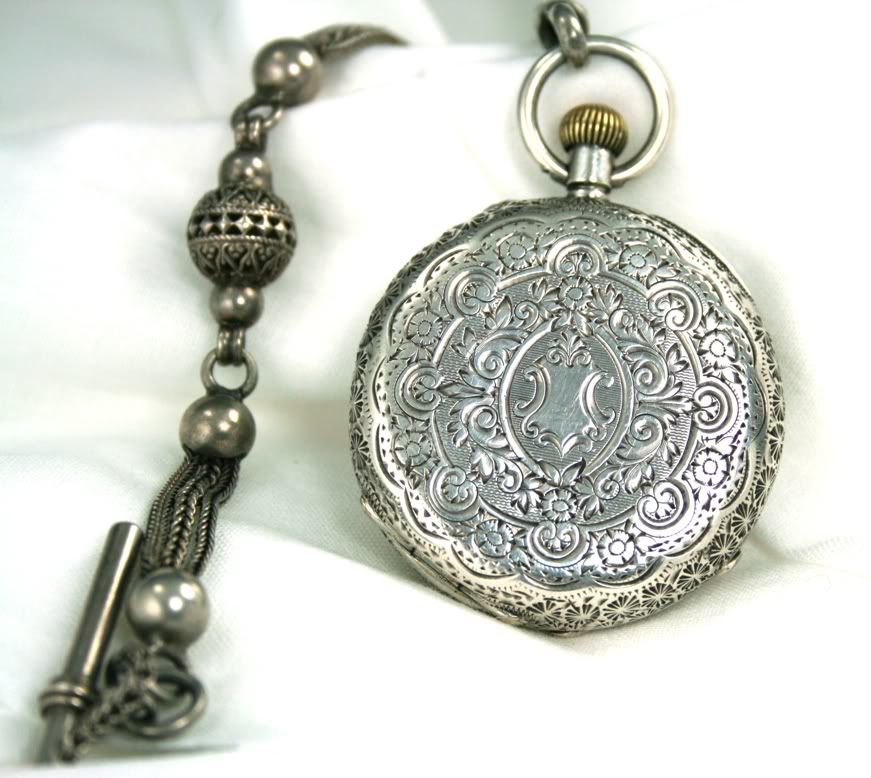 Hello and Help! I picked up today this vintage exquisite silver pocket watch. The workmanship in the silver is just remarkable as is the face of this beautiful piece. However, I have no idea how to ID the hallmarks. There is a coin attached to the fob dated 1838 but of course this could have been added later. However, it seems as if everything does go together. The silver beads on the fob match the tooling on the case so I have no reason to believe that this wasn't all designed to be presented as is. It is stamped 933. I was not familiar with that silver content.