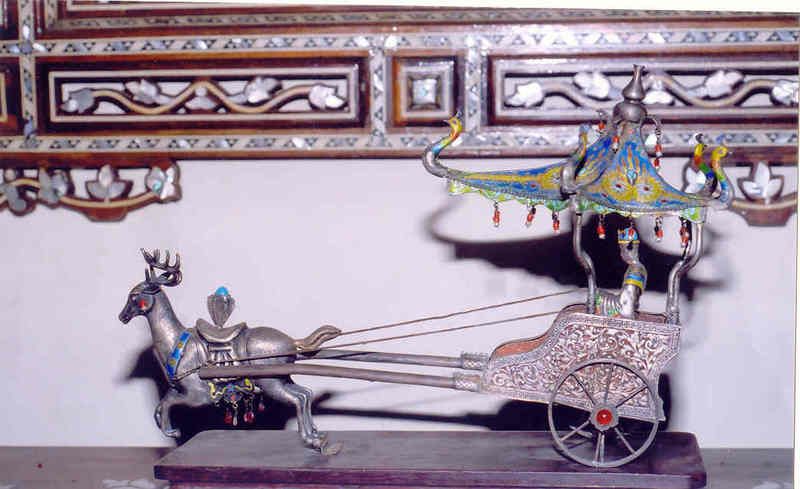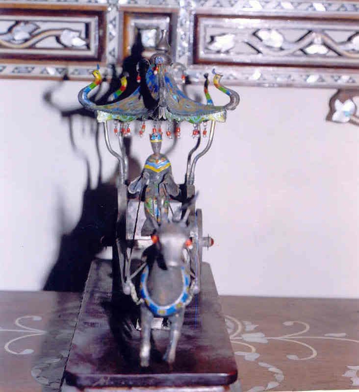 The pictures are obscured by the background mother-of pearl mirror frame, please disregard. If you can see it, in picture entitled silver.3 is an engraved marking, the only found on this piece. M 1859 is written. Perhaps this would give you a clue as to the maker place. The parasol, elk and the wheel hubs are adorned with semi-precious stones, pearl, coral, turquoise and perhaps what is known as Mecca stone or carmine. There is no doubt as to the authenticity of the piece. I have not yet cleaned it. I do know that the base and the reins are not its original.
