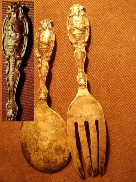 Hi all! I'm having some trouble finding what I need. I've read the guidelines for this forum and believe this post may be borderline unacceptable, but I just don't know where else to turn. Frankly, I’m baffled! I'm brand new to the world of silver collecting. My forte is antique postcards-- a different universe, altogether! Please take a look at my set {Pardon the funky colors-- I fooled around with them to make the details stand out}: