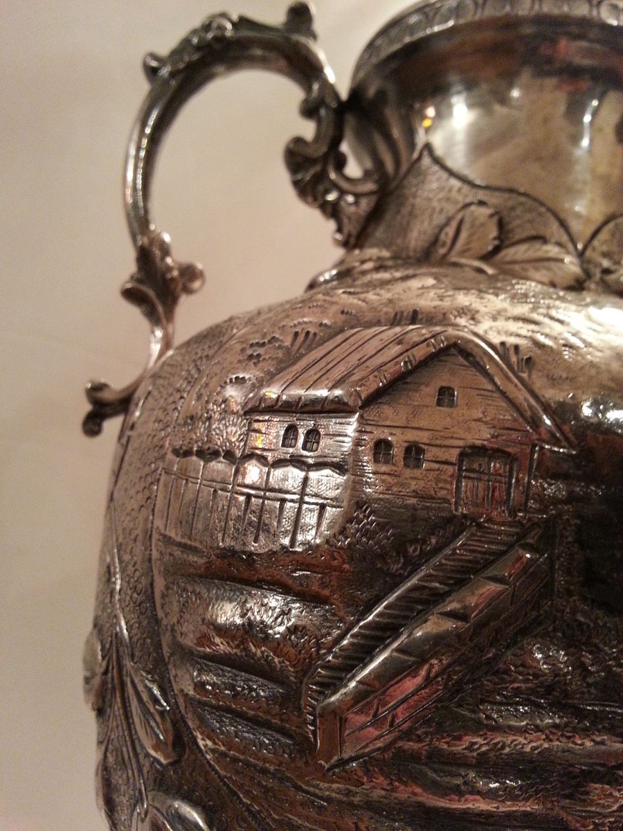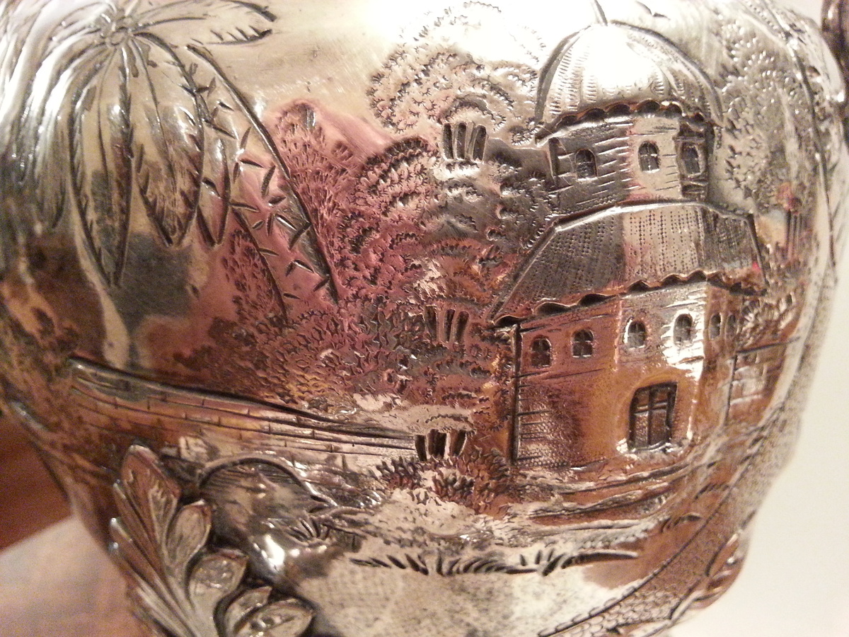 I am wondering if it is early American or what the original might be? It's hand chased, silver plate, unique designs that has me curious of the scenic pictures of what looks like palm trees in it. One scene has a church, a house/ village home, but the architecture of the buildings is not something I recognize. Maybe Spanish?