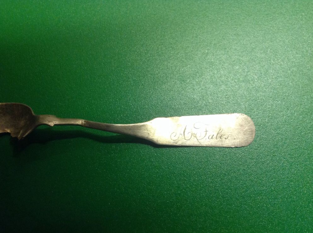 Good evening all and thank you in advance for any help. I was metal detecting in my yard and found this silver? Baby spoon with the name A . Fales on it. My house was built in 1828, and Fales is a name that goes back to the 1700 s in town.